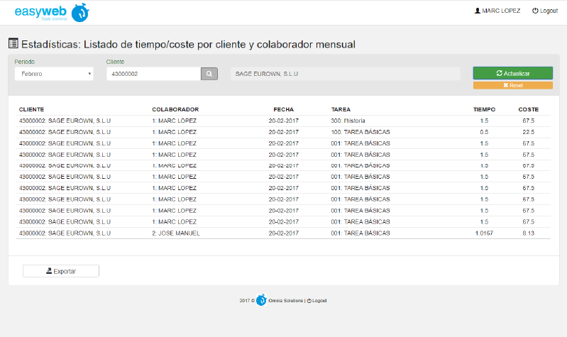 También dispone de una serie de opciones solo de administrador, tales como la creación y edición de usuarios, tareas y clientes. Y un apartado de estadísticas donde listar y exportar, toda la información registrada diariamente por los usuarios de la aplicación calculando el tiempo invertido en cada cliente así como el coste y el precio teórico de venta según la configuración de cada usuario.