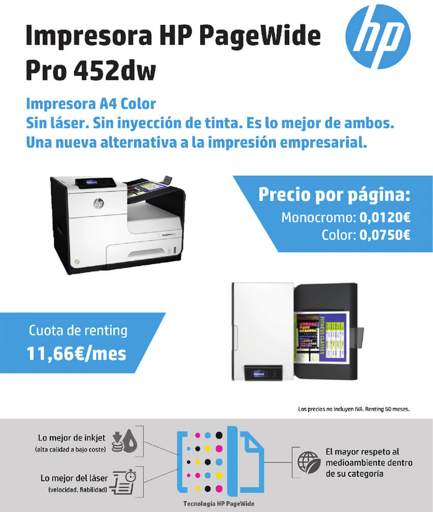 Presentem aquesta nova promoció de la impressora multifunció A4 sense injecció de tinta ni laser amb una quota de renting mensual de 11,66€ i un cost per pàgina de 0,0120€ (ByN) i 0,0750€ color.