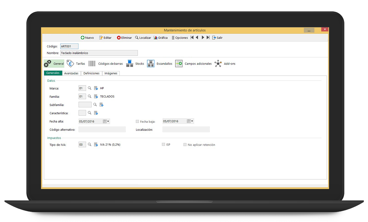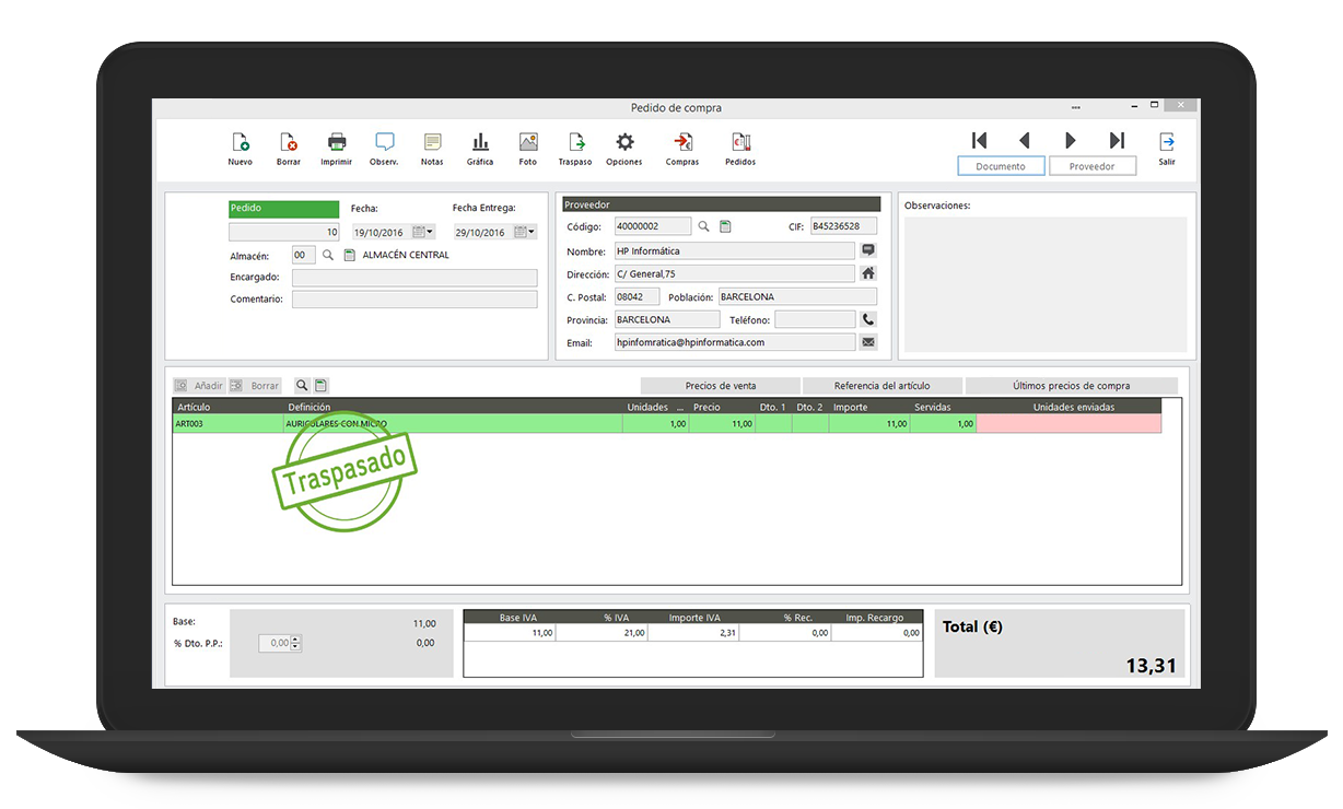 Gestión de almacenes con control de stocks, traspasos entre almacenes, regularizaciones e inventarios.